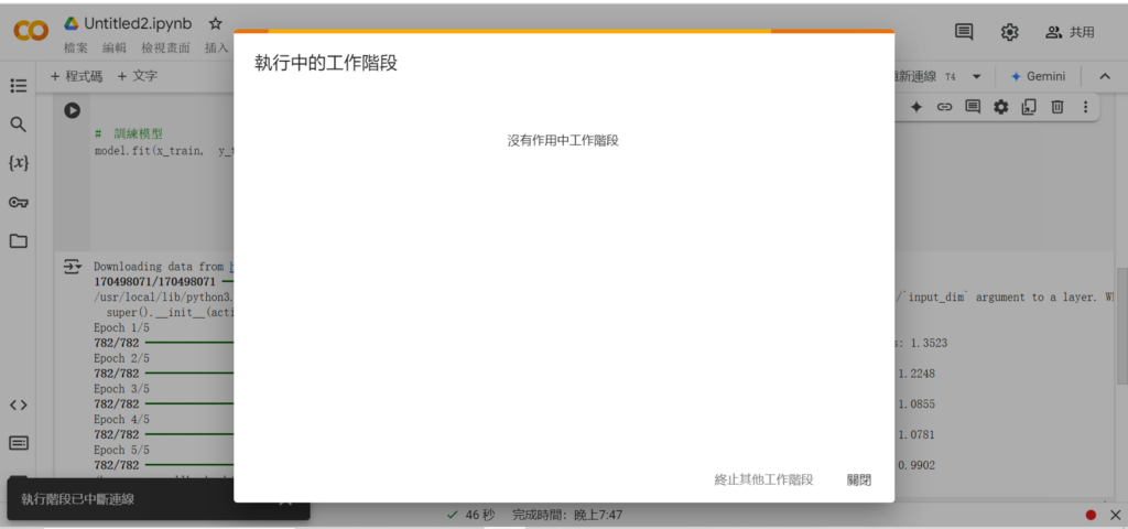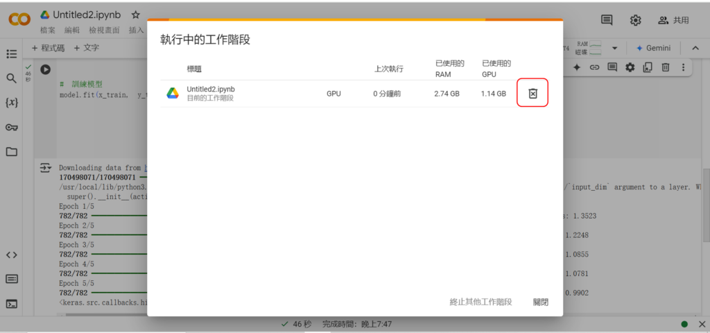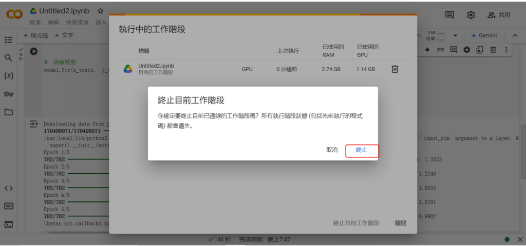 原本在畫面上的執行階段就會消失,代表我們就把GPU資源釋放出來。這樣就結束,可以關掉筆記本了。