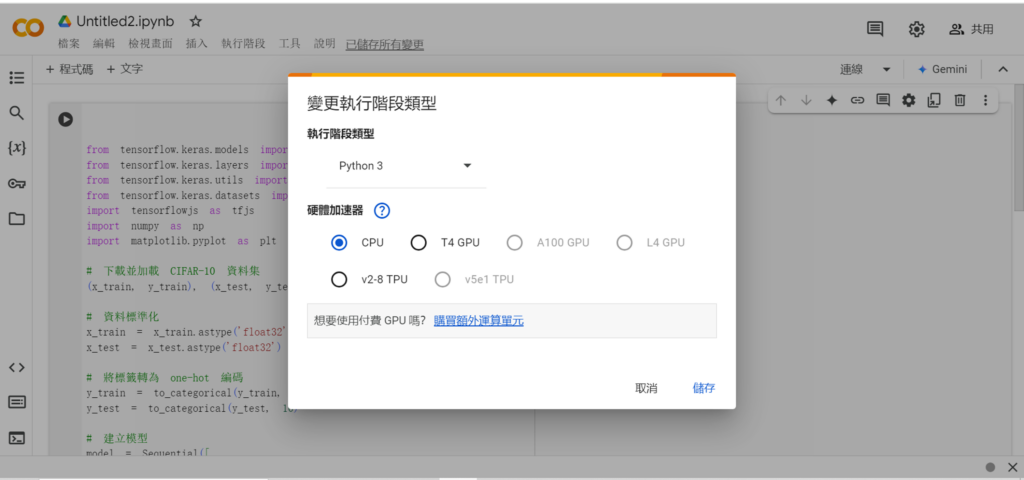 就可以看到有很多運算資源的選擇,有CPU,GPU,TPU。對於要訓練CNN這種圖像辨識比較複雜的模型,會採用GPU來進行運算。