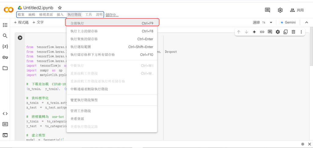 這邊就直接輸入機器學習訓練的程式碼,是用CNN訓練cifar10的模型。在這一步程式碼已經建立完成後,要開始配置運算資源。