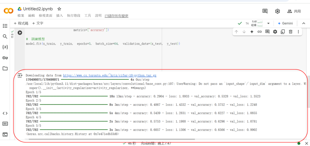 這時候可以把畫面往下滑,滑到有顯示執行結果的部分,像是我們這邊一開始會先下載cifar10的資料,以及有不同epoch的訓練結果。會有精確度與損失。