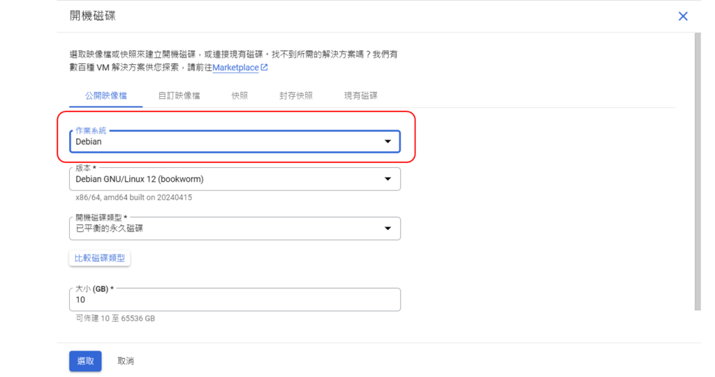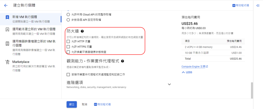 在防火牆的部分,可選擇允許HTTP或HTTPS的流量(紅色方框),如果只有把VM當作純開發模型的環境,沒有要從網頁連進來,是可以不用打開這個選項。