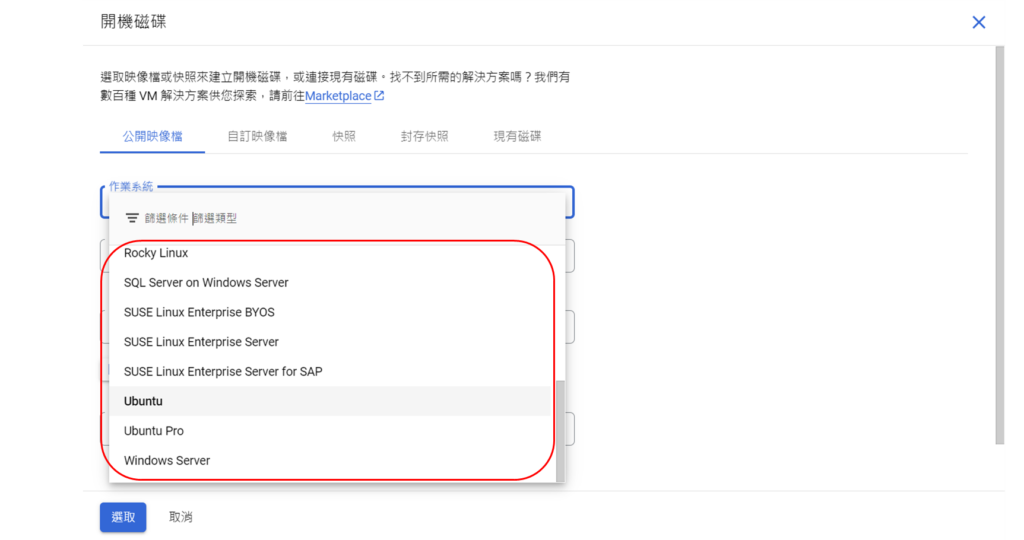 像是有ubuntu的作業系統也有windows系統可使用(紅色方框),選定自己熟悉的作業系統。