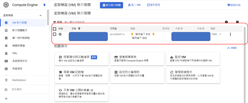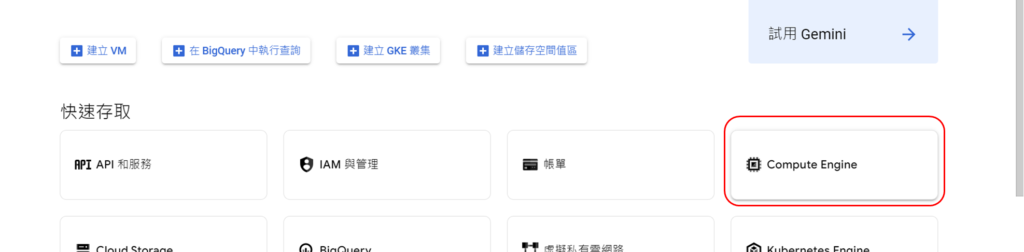 一開始在進入GCP的畫面,可以點選compute engine(紅色方框)。