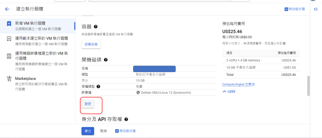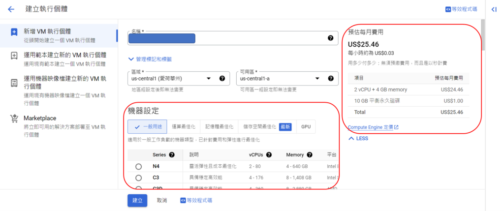 點進去之後,內建會先幫我們預設好設定,像是還有不同等級的虛擬機器(紅色方框),容量與CPU效能都不太一樣,收費也不同,選定好自己要用的機器後,在右邊也會有預估價錢(紅色方框)。