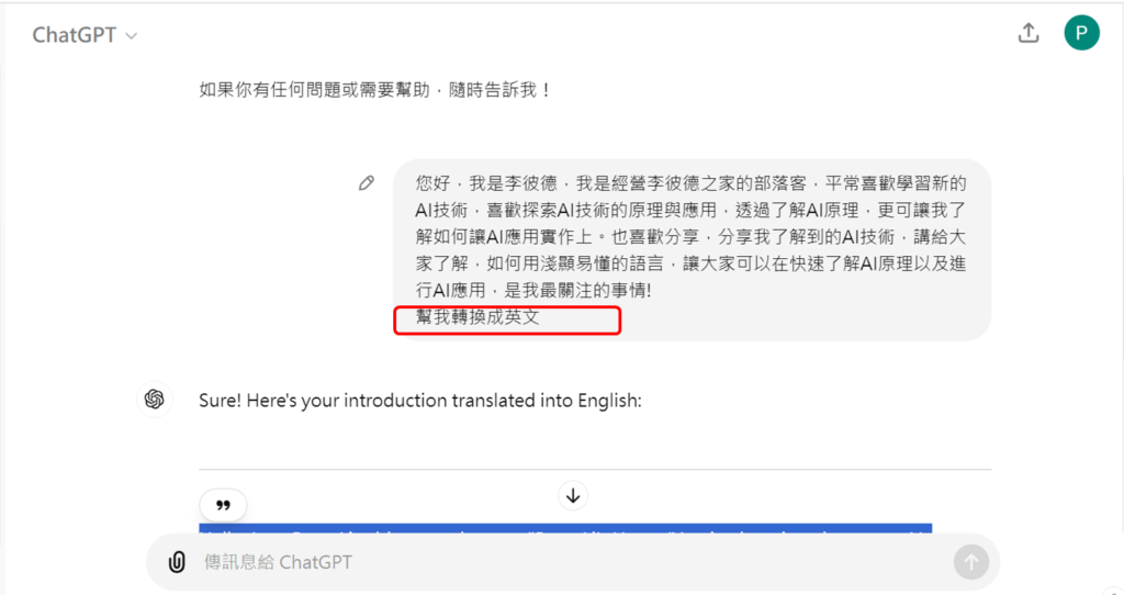 我要把它翻成英文,翻譯方式可以在原文下面,輸入要ChatGPT幫忙的指令,像是我輸入幫我轉換成英文。