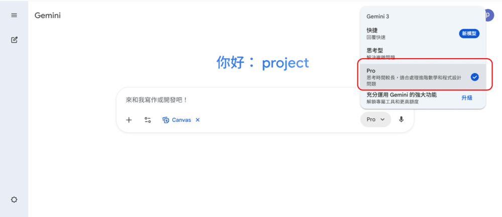 點選切換模型的部分,選擇Pro模式。
