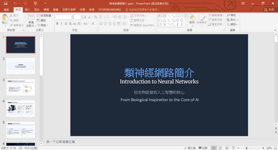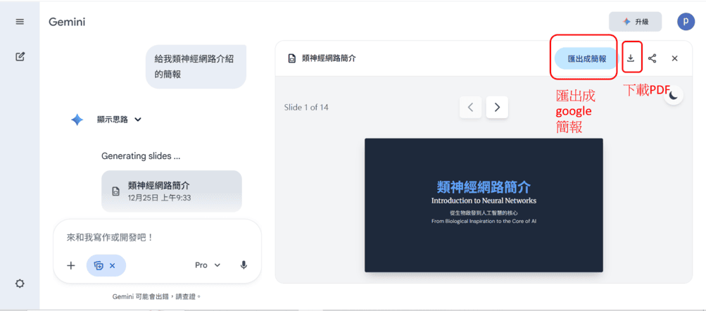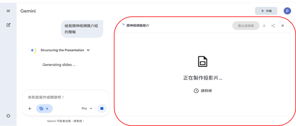 步驟3: 輸入生成簡報指令,像是輸入”給我類神經網路介紹的簡報”。