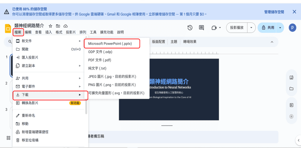 接著按下上方檔案按鈕,再按下pptx格式即可得到PPT。
