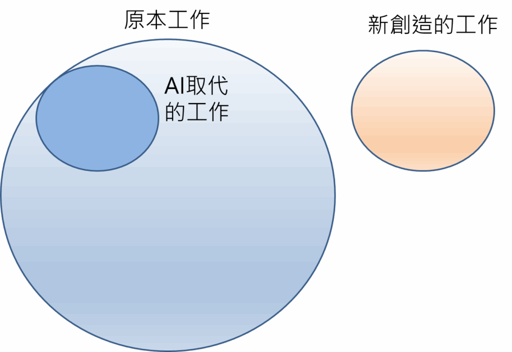 對於現在的我們,對於AI完全能取代的工作,有些確定,但也還有很多工作不敢確定,我們只是覺得有可能會被AI取代,但以後會不會真正完全被AI取代,這還是不確定,然後也有預期會有新工作會被創造,但創造到什麼程度,以及什麼工作確切會產生,目前也都不太明朗。都是處在觀望的階段。