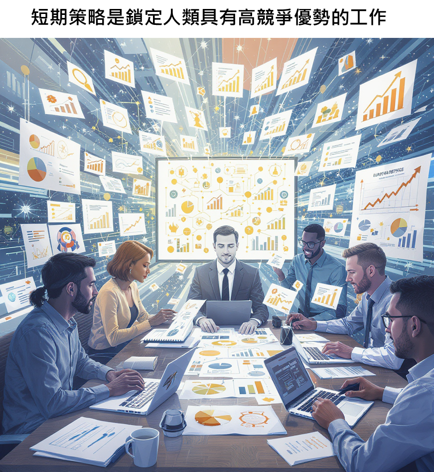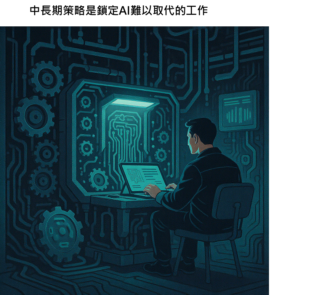中長期策略就會評估到底哪些工作AI是難以取代,會持續紮根,舉例來說,溝通協調不同的人,確保專案推進,是AI目前比較難以取代的部分,因為這其中牽涉很多因素,那這類型的工作,也有望可以長期去做補強向下紮根,持續加強自己的能力,在未來有機會就可以延伸到這些工作,讓自己也多一個選擇的機會。