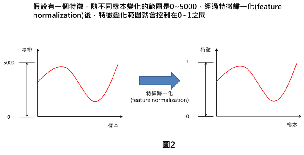 到底特徵歸一化是什麼呢?舉例來說,假設有一個特徵隨不同樣本變化的數值範圍落在0~5000,而特徵歸一化在做的事情就是讓這個特徵的數值範圍全部控制在0~1之間。