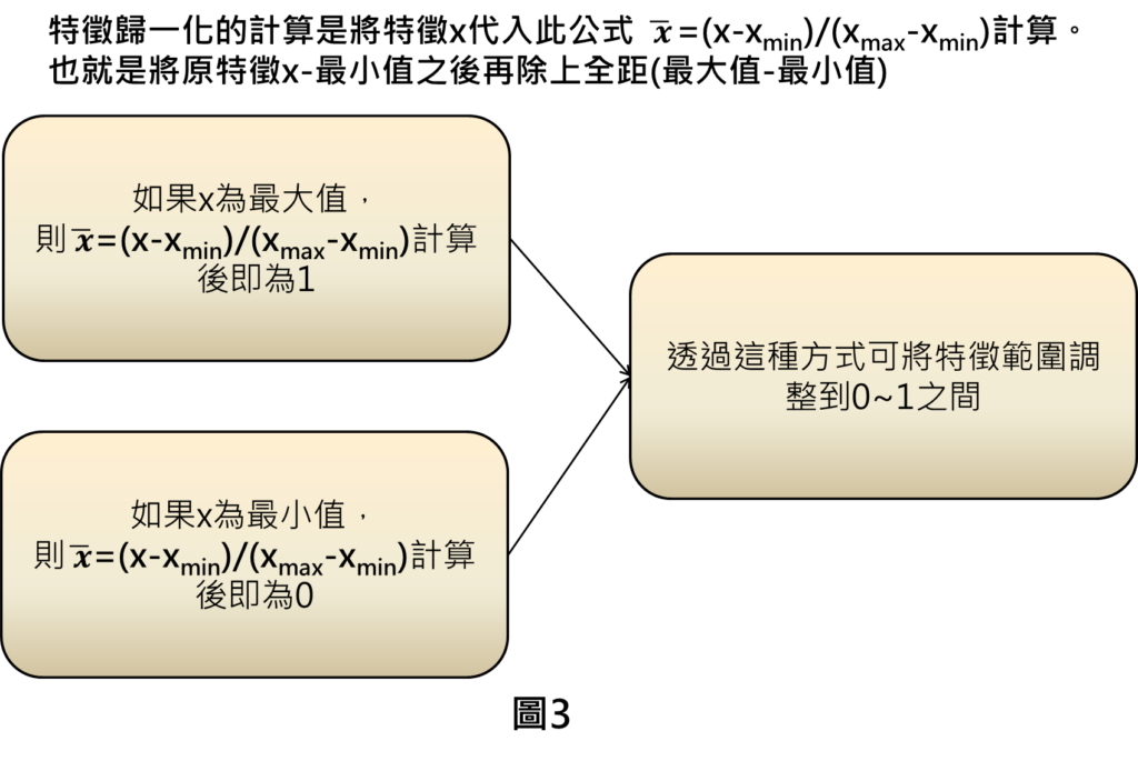 特徵歸一化的作法是將原特徵x扣掉最小值再除上全距來得到,透過這樣的作法就可以讓特徵範圍調整到0~1之間,舉例來說,假設特徵x為最大值,透過特徵歸一化的計算後,則會得到1;假設特徵x為最小值,則特徵歸一化計算後,會得到0,其他特徵數值必定介於最大與最小值之間,因此,可將特徵範圍調整到0~1之間。