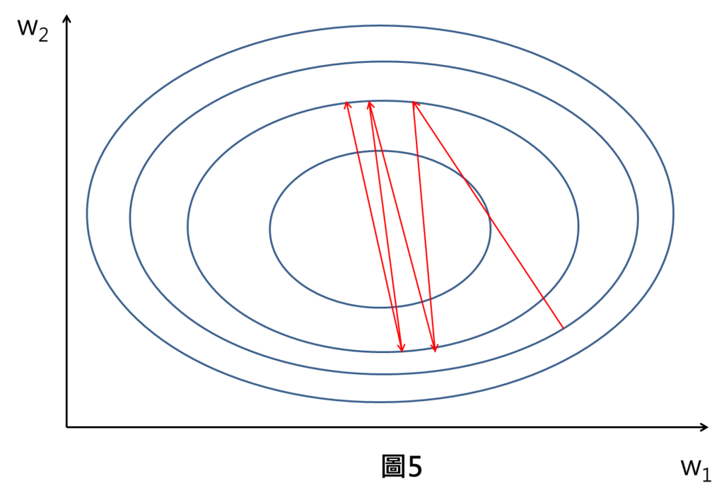 假設一個情形,我們輸入的特徵只有兩個x1與x2,這兩個特徵的數值範圍差異很大,像是x1範圍落在0~1,x2範圍落在0~1000,這時候進行梯度下降的權重差異也很大,像是w1為0~1,w2為0~0.001,此時,整個損失空間為橢圓形。(這邊的損失空間圖形以等高線方式呈現,也就是同一個橢圓形上,代表有相同的損失數值,在正中間為谷底代表是損失最低點。)