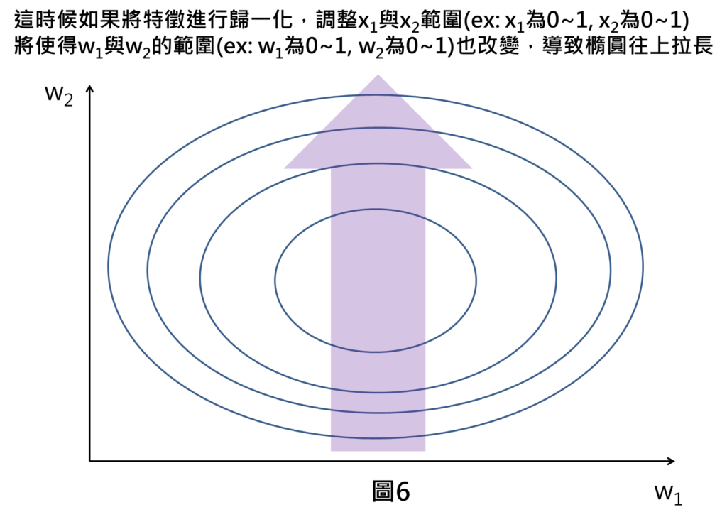 這時候如果我們將特徵進行歸一化,將兩特徵數值範圍調整到0~1之間,將使得w1與w2的數值範圍也隨之改變,舉例來說,原本x2的數值範圍為0~1000,w2範圍為0~0.001之間,而現在x2的數值範圍調整為0~1之間,w2範圍也恢復正常落在0~1之間,造成整個w2範圍變大,導致整個損失空間橢圓形往上拉長。