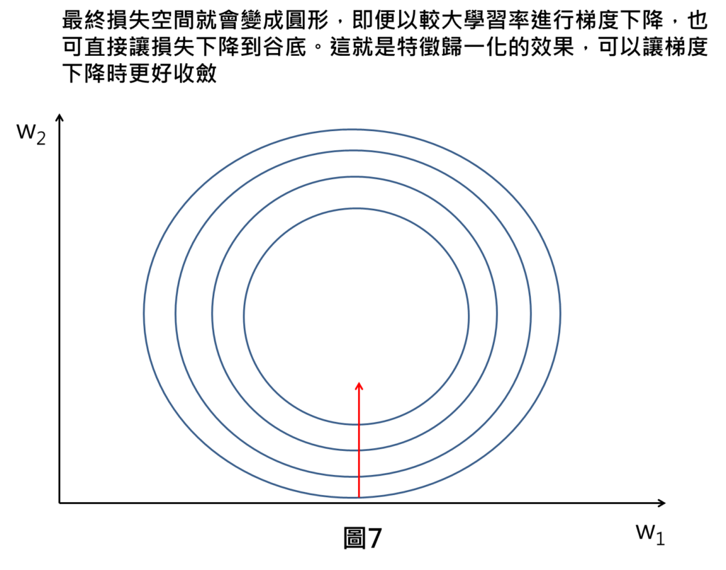 最終損失空間就會變成圓形,圓形的好處是在任意點進行梯度下降,其梯度方向皆指向圓心(即為谷底),即便在較大的學習率下降,損失也可以快速下降至谷底,使得機器訓練時有更好的收斂效果。
